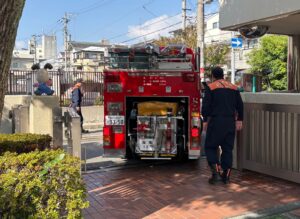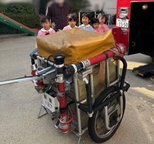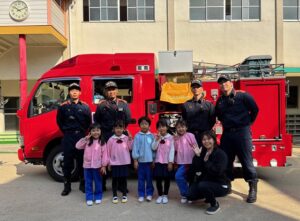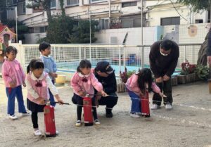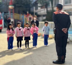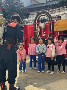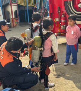 ホーム > 日々のこと > 避難訓練 2025/11/10 避難訓練を行いました! 消防士さんの話をしっかり聞いています! 消火器の訓練をさせてもらいました🔥 とても上手です! 特別に消防服も着せてもらいました! 「重かった~!」 酸素ボンベも装着させてもらいました! 消防車も近くで見られて 嬉しそうな子どもたちでした! ありがとうございました🚒 B! LINEへ送る - 日々のこと